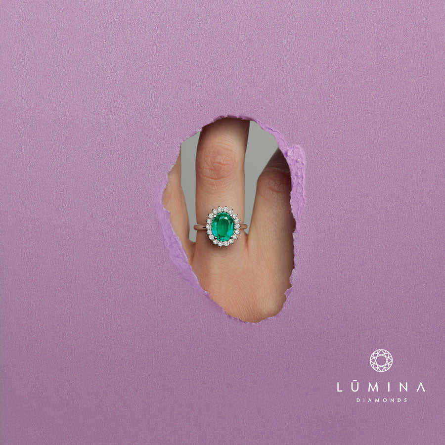 Anello con smeraldo ovale e contorno di diamanti