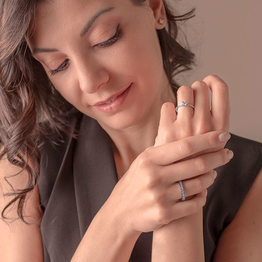 Anello Solitario con pavé sul gambo ed incastonatura alta
