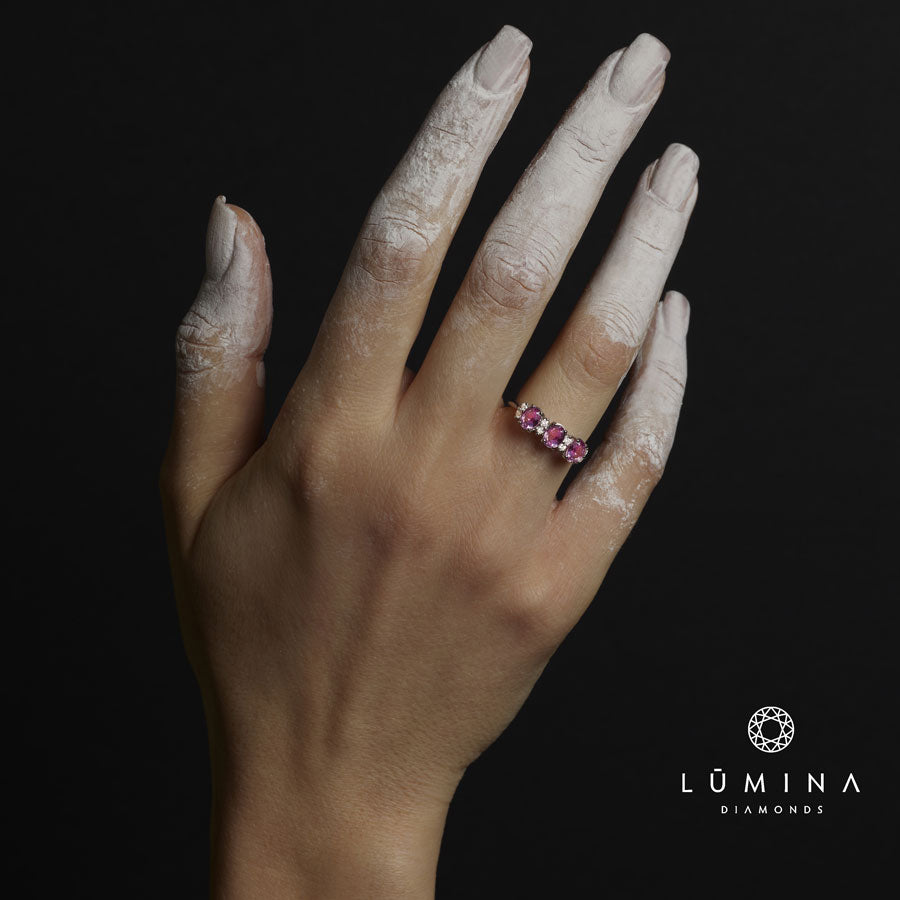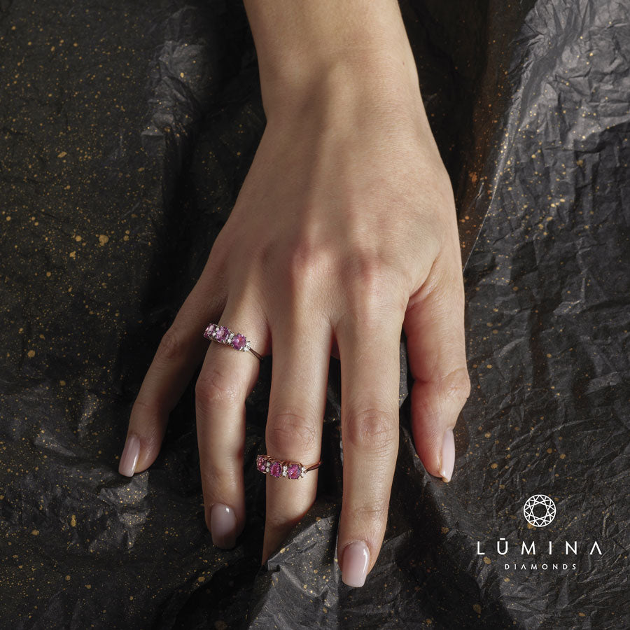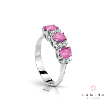 Anello trilogy in oro bianco con zaffiri rosa ovali e diamanti