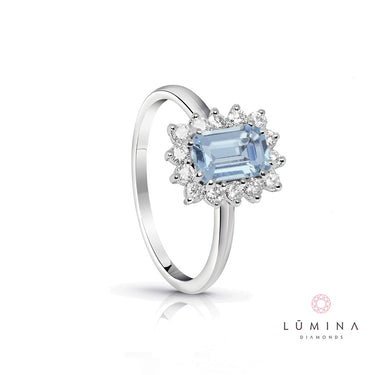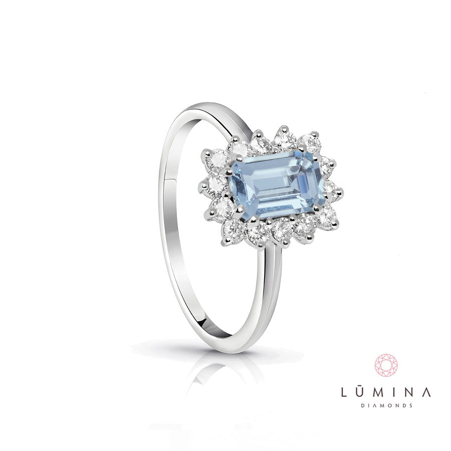 Anello con acquamarina ottagonale e contorno di diamanti